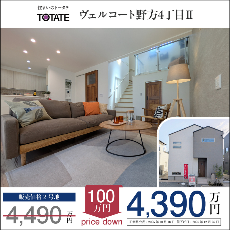 ◆1号地…4580万円から4480万円(旧価格公表日:1/3 新価格発表日:12/26) ◆2号地…4490万円から4390万円(旧価格公表日:10/18 新価格発表日:12/26)