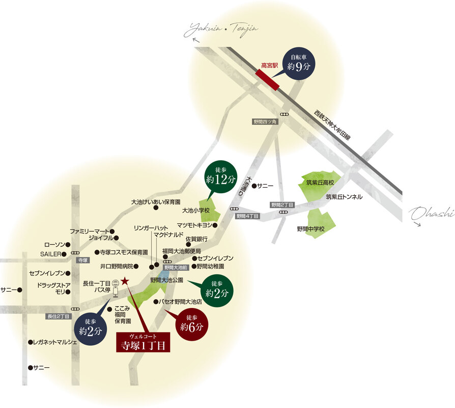西鉄天神大牟田線「高宮駅」まで自転車で約9分。天神天神まで約6分、博多駅まで約11分でアクセスします。