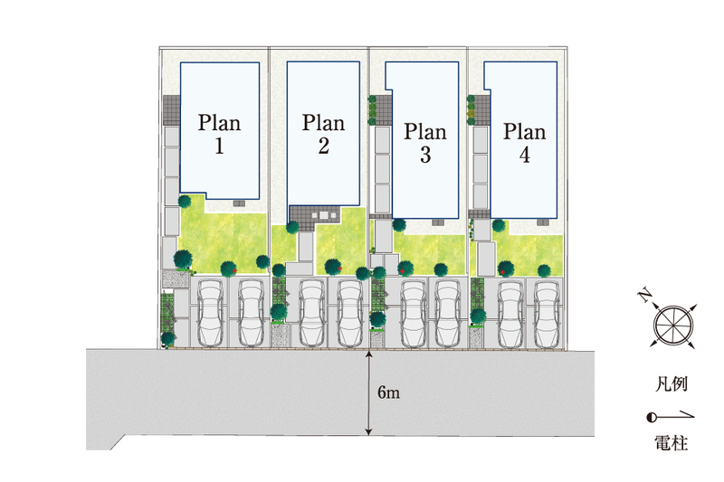 魅力1 全棟ランドリースペース標準採用。全邸南道路付け×普通車2台並列駐車。