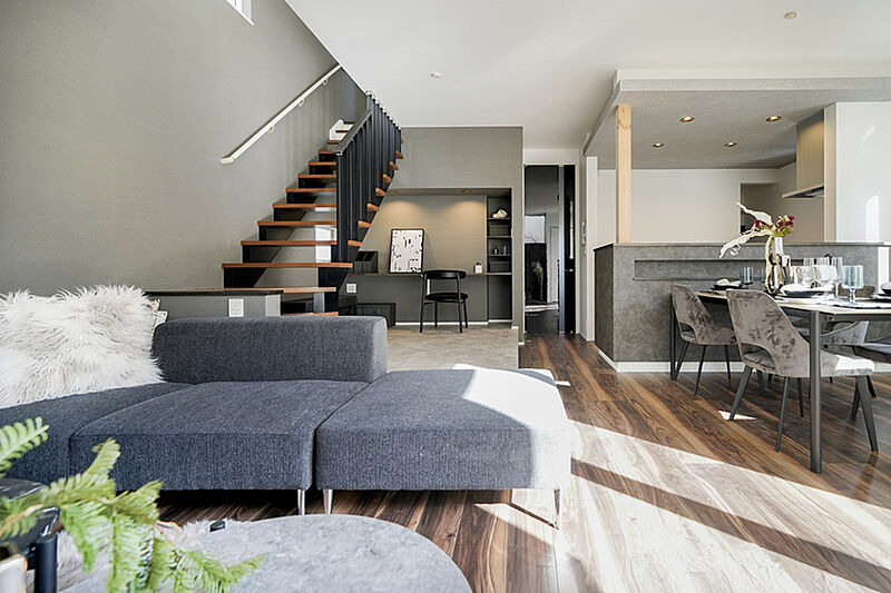 お洒落なデザイン階段とカウンタースペースのあるプラン。