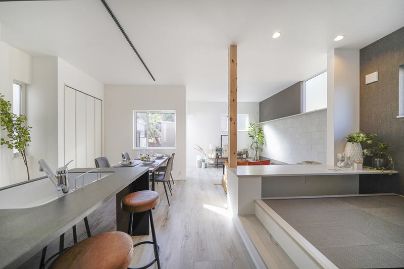 フラットキッチンとステージDENのある開放的な空間。
