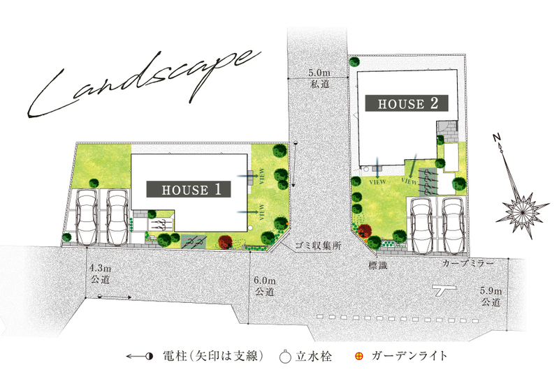 | 駐車場 | 2台 | 道路の幅員 | 4.3m公道、5.9m公道、6.0m公道、5.0m私道 |