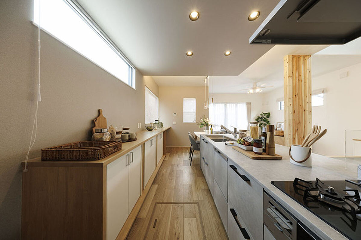 床暖房、ハイブリッド給湯器、電動シャッター、宅配ボックスなど、快適な暮らしを支える設備を標準装備。キッチンやバスルーム、洗面化粧台もデザイン性と機能性に優れたものを採用しています。さらに、ハイシーリング&ハイサッシや適材適所の収納計画など、全邸共通のこだわり仕様を備えています。
