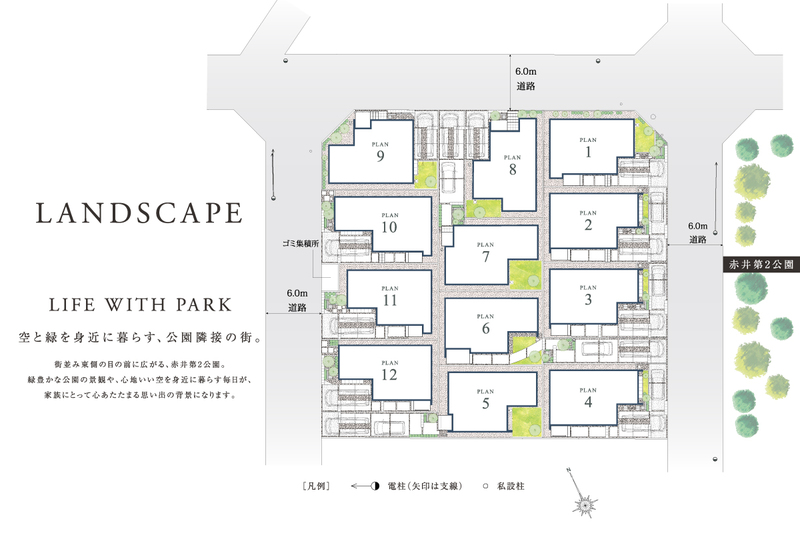 四季折々の赤井第2公園の緑景に憩う立地。街区内道路の陽だまり、四季折々の空の景観に包まれる、心地いい暮らしを描く全12邸の街。住まう人の交流を育む、心あたたまる住まいを創出しました。