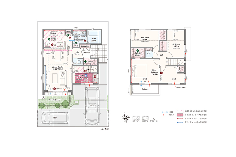 床暖房、ハイブリッド給湯器、電動シャッター、宅配ボックスなど、快適な暮らしをサポートする設備を標準採用しています。 キッチンやバスルーム、洗面化粧台などの設備も、デザイン性と機能性に優れたものを採用。 ハイシーリング&ハイサッシ、適材適所の収納計画なども全邸に共通する仕様です。