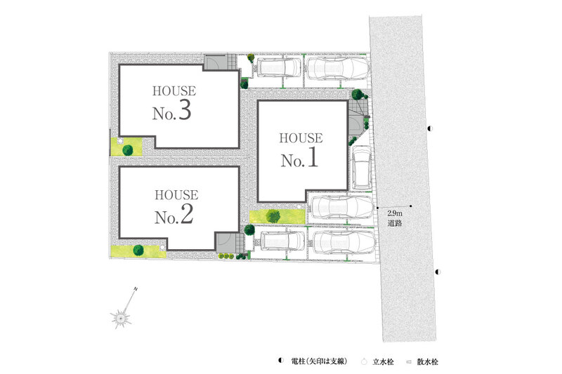 | 建物面積 | 96.47m2~104.34m2 | 土地面積 | 100.28m2~112.84m2 / 私道負担なし |