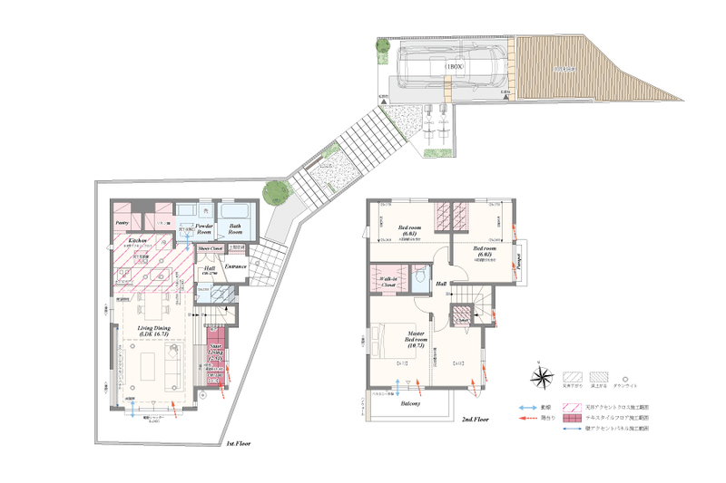 床暖房、ハイブリッド給湯器、電動シャッター、宅配ボックスなど、快適な暮らしをサポートする設備を標準採用しています。 キッチンやバスルーム、洗面化粧台などの設備も、デザイン性と機能性に優れたものを採用。 ハイシーリング&ハイサッシ、適材適所の収納計画なども全邸に共通する仕様です。