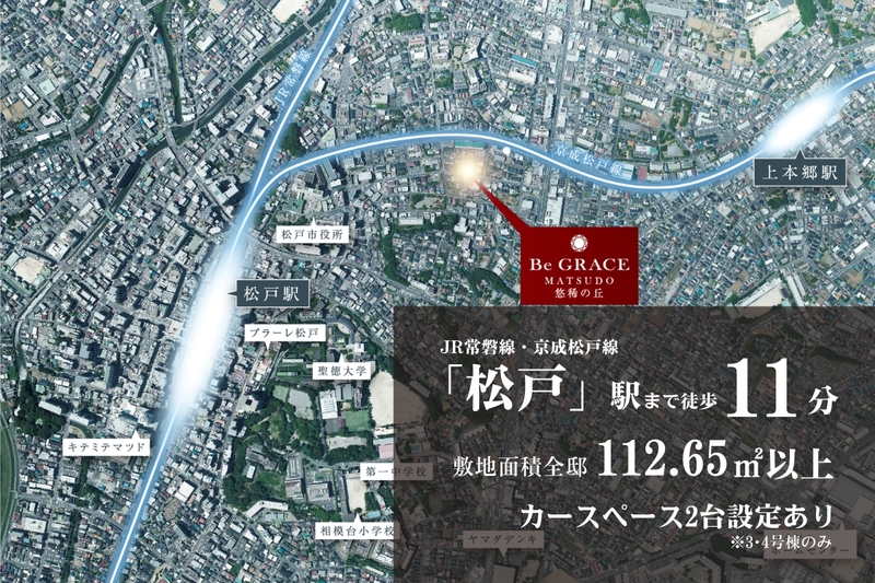 魅力1 JR常磐線・京成松戸線「松戸」駅まで徒歩11分。敷地面積112m2以上