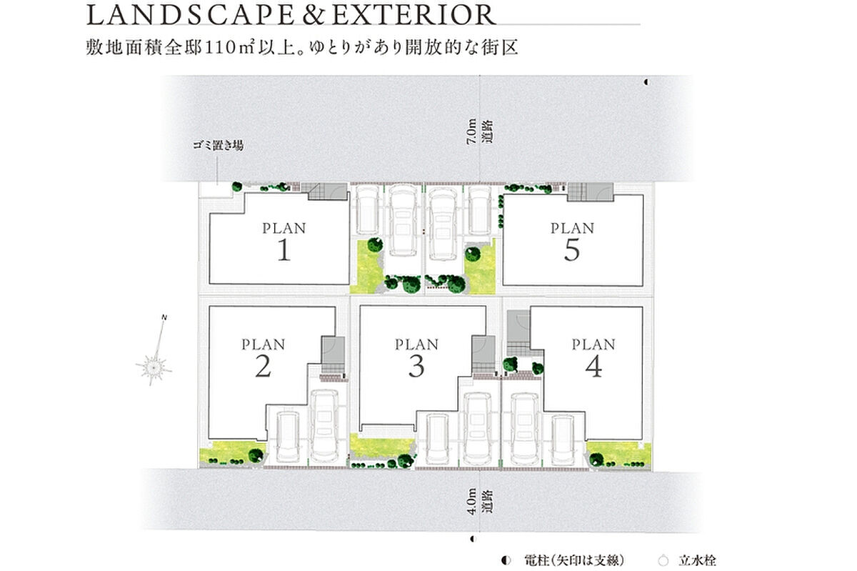 ◆敷地面積全邸110m2以上のゆとりある開放的な街並み