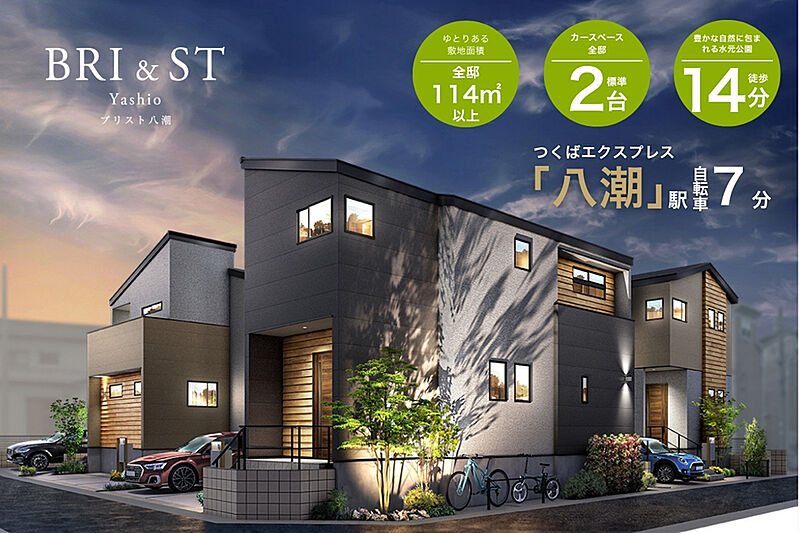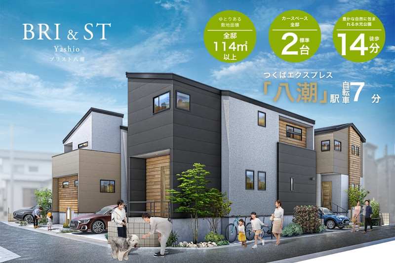 小粋なハウスデザインで、海辺のリゾートを思わせる街並みを描きました。敷地面積全邸114m2以上×カースペース全邸2台標準設定。