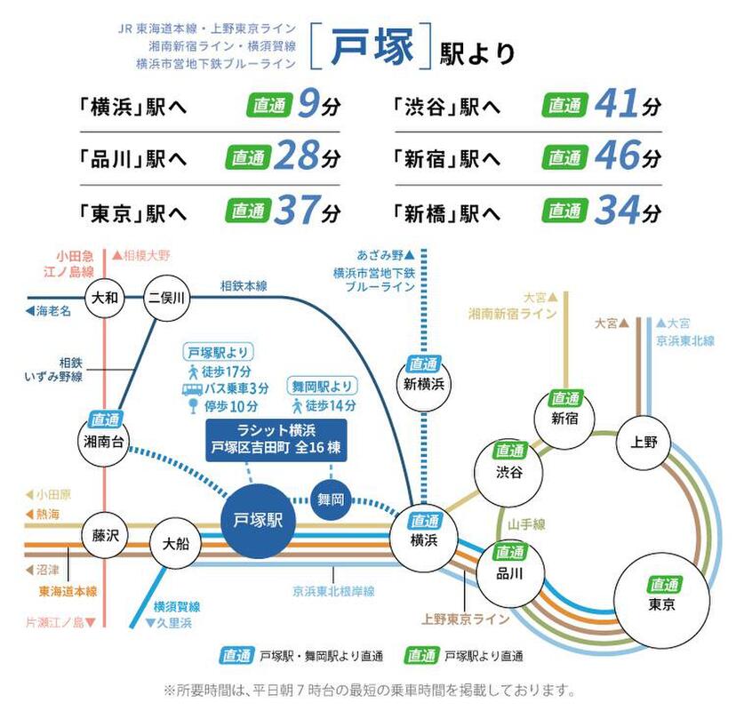 JR東海道本線「戸塚」駅 徒歩2分 JR横須賀線「戸塚」駅 徒歩2分 横浜市営地下鉄ブルーライン「戸塚」駅 徒歩2分 |