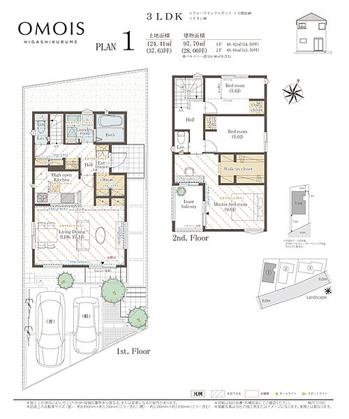| 建物面積 | 96.88m2~97.7m2 | 土地面積 | 121.91m2~124.41m2 / 私道負担なし |