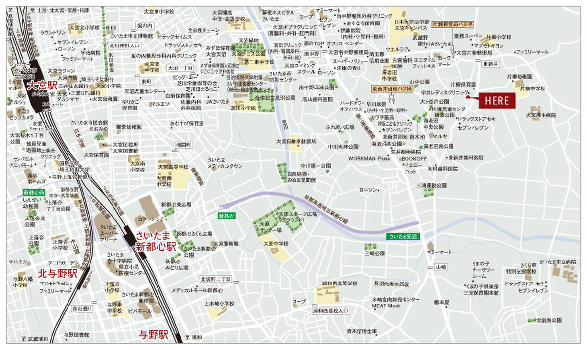 - JR東北本線「大宮」駅 バス23分 片柳郵便局バス停 徒歩6分JR東北本線「さいたま新都心」駅 バス15分 東新井団地バス停 徒歩8分JR東北本線「浦和」駅 バス27分 東新井団地バス停 徒歩10分