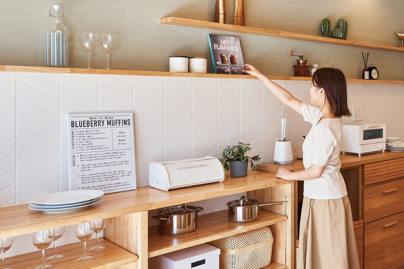 キッチンの背面に棚を設置可能。お気に入りの食器や写真、観葉植物などを並べられる我が家のギャラリーになります。※棚は付きません、下地のみとなります。