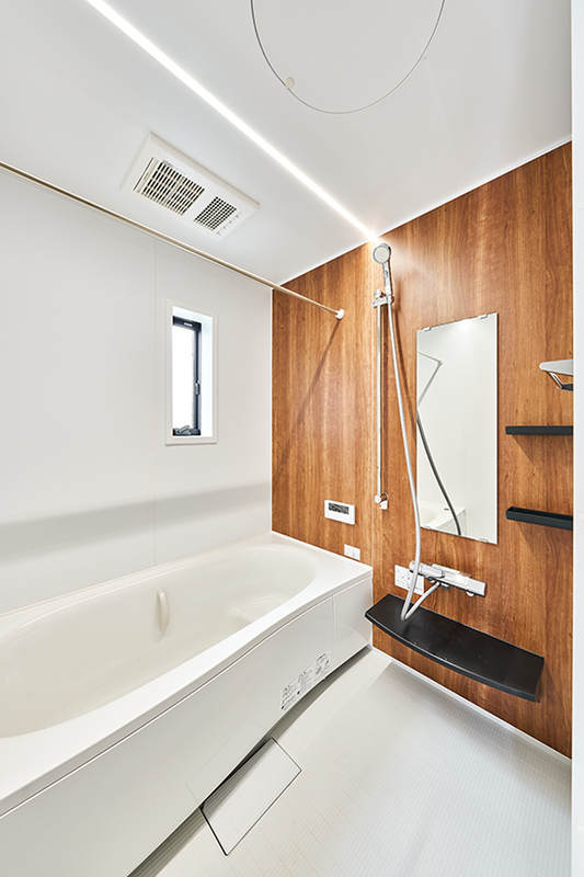 浴室を包み込むように照らすライン照明や、乾きやすく滑りにくい床材を使用するなど、リラクゼーション効果を高めてくれるバスルームを描き出しました。