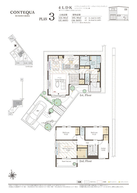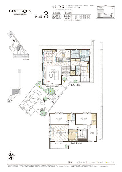| 建物面積 | 104.75m2~105.99m2 | 土地面積 | 122.04m2~124.98m2 / 私道負担なし |