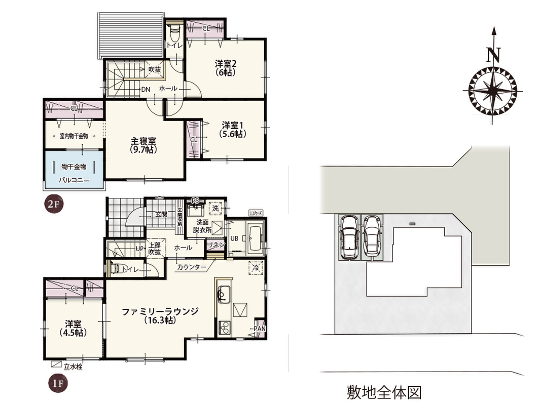 | 建物面積 | 103.09m2・105.99m2(31.18坪・32.06坪) | 土地面積 | 181.05m2~187.94m2(54.76坪・56.85坪) |