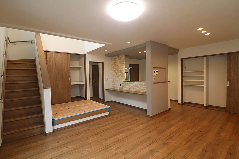 ■リビングに設けられたタタミスペースはキッチンからもよく見えるので、お子様の遊びスペースとして活躍しそう。(5号棟)