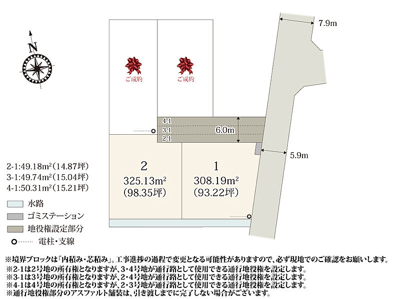 | 建物面積 | 99.36m2・105.98m2(30.00坪・31.99坪) | 土地面積 | 308.19m2・374.31m2(93.22坪・113.22坪) |