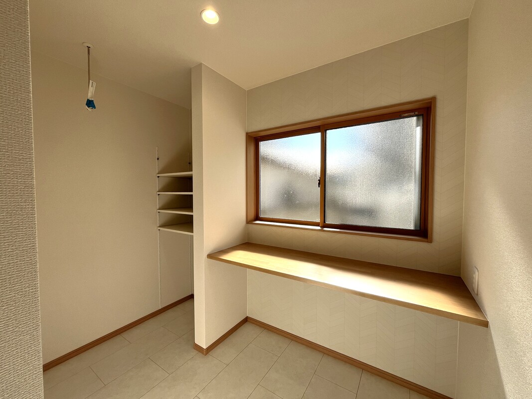 ランドリースペースがポイントの家。カウンター付ランドリースペースは雨の日や花粉などの埃が気になる時もお洗濯物が干せる便利なスペースです(1号棟)