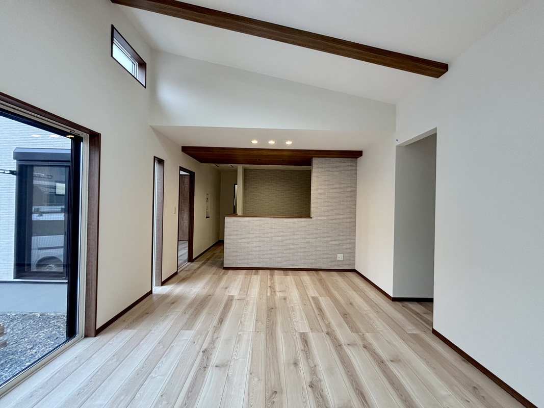 勾配天井のあるリビングは見せ梁を用いることでおしゃれな空間に。毎日を過ごすところだから飽きのこないデザインに仕上げました(1号棟)
