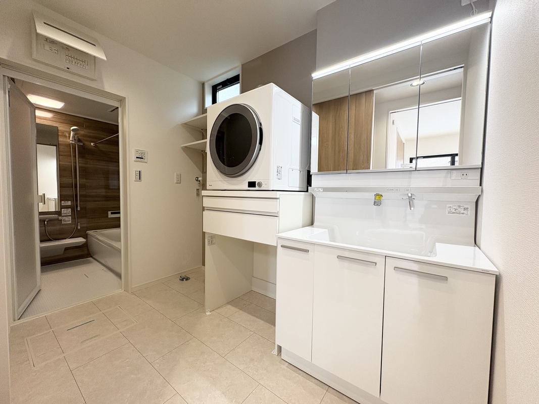 ■全居室南向きの自然光が入りやすい明るい空間でゆったりくつろぎの時間を!乾燥機付きの広々洗面所に2階は室内物干し、ツインバルコニーと洗濯作業をサポートしてくれる家です!(1号棟)