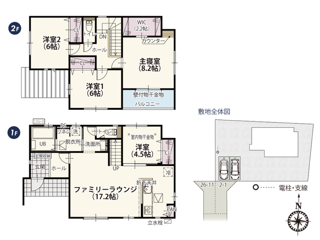 | 建物面積 | 105.57m2・105.99m2(31.87坪・31.99坪) | 土地面積 | 214.99m2・282.66m2(65.03坪・85.50坪) |