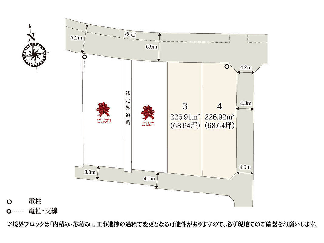 | 駐車場 | 2台 | 道路の幅員 | 南3.3m・4.0m、東4.0m~4.3m、北6.9m~7.2m |