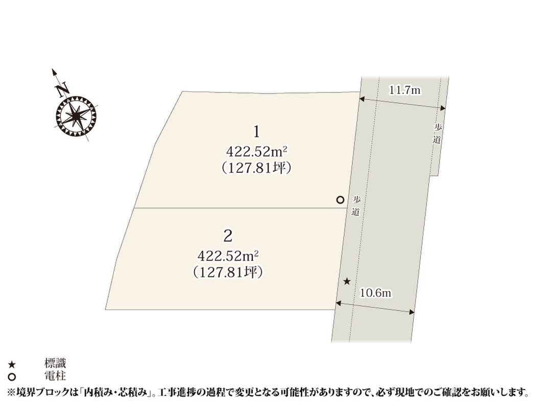 | 建物面積 | 102.68m2・105.99m2(31.06坪・32.06坪) | 土地面積 | 422.52m2(127.81坪) |