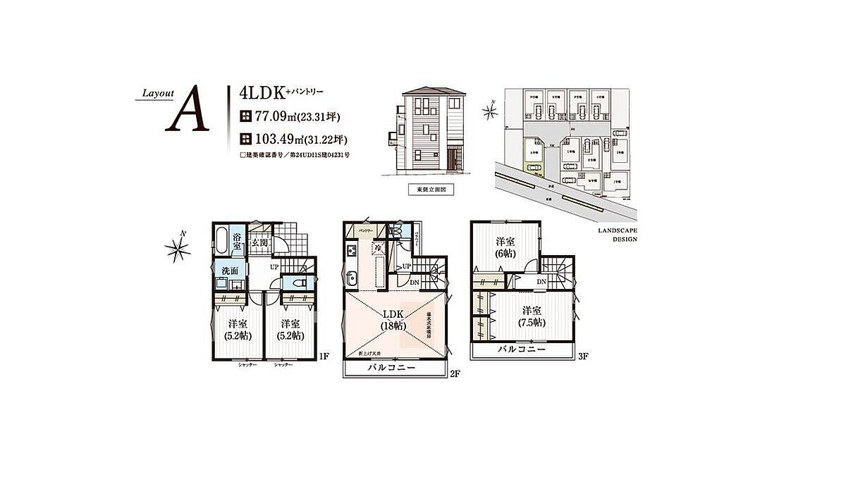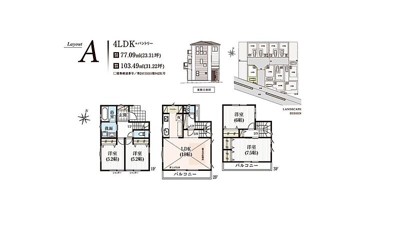 | 建物面積 | 101.42m2(30.67坪)~103.49m2(31.30坪) | 土地面積 | 70.09m2(21.20坪)~77.09m2(23.31坪) |