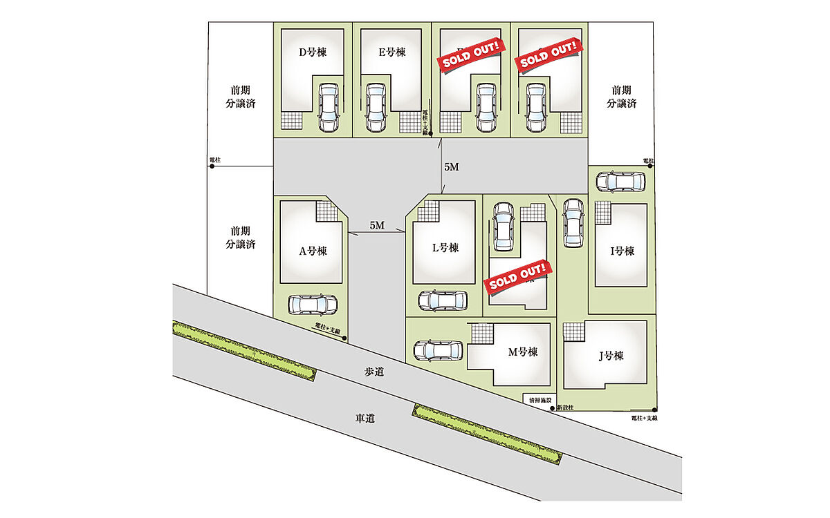 | 駐車場 | 1台(一部ビルトインガレージあり) | 道路の幅員 | 道路幅:5m~71.4m、アスファルト舗装 |