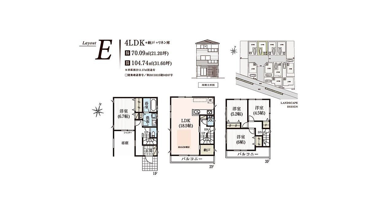 E号棟 間取り 4LDK+納戸+リネン庫 価格 5380万円 建物面積 104.74m2 土地面積 70.09m2 -