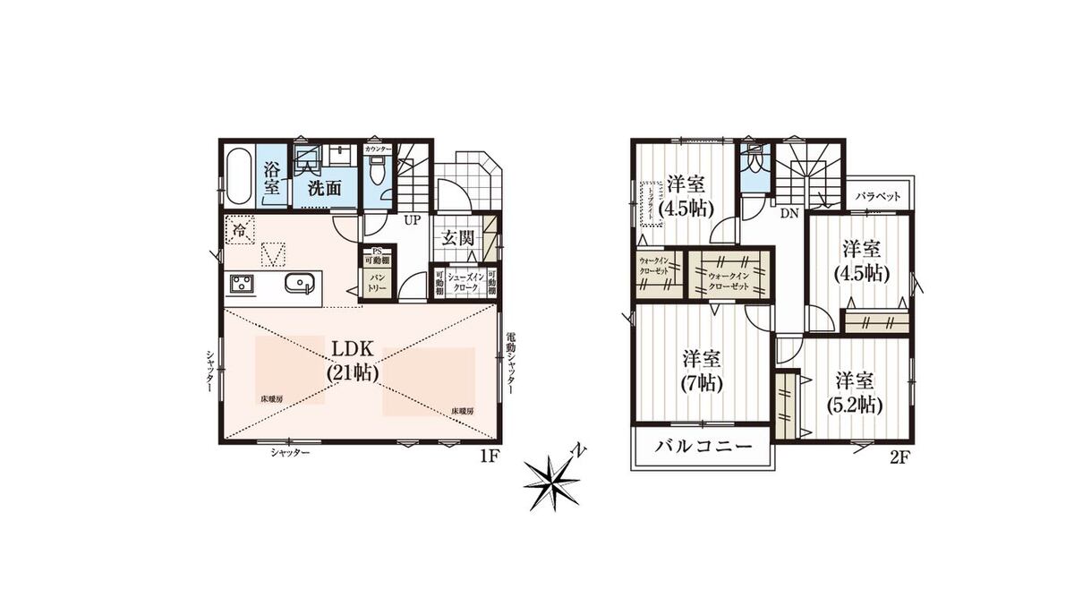 | 建物面積 | 102.68m2(30.98坪)~104.33m2(31.48坪) | 土地面積 | 148.74m2(44.99坪)~174.80m2(52.87坪)※協定部分47.82m2~68.97m2含 |