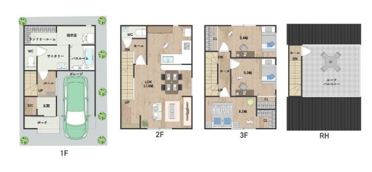 - ※完成予想図やCG合成画像は、門塀・植栽・庭・外観等、実際とは多少異なる場合があります。
