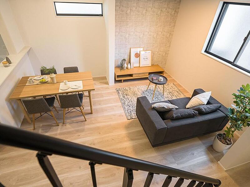 デザイン性が高く、空間の圧迫感を軽減するスケルトン階段を採用。より広々と感じられるよう、明るいカラーコーディネートで爽やかな団欒空間に◎