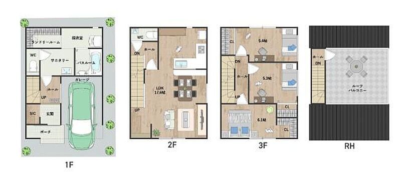 ゆったりとしたランドリールームと脱衣室が特徴のサニタリースペースを1階に配置。開放的なルーフバルコニーは多彩に活用可能です◎《建物面積91.52m2》