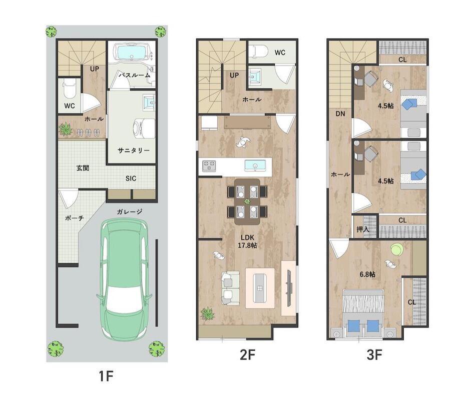 17帖超の2階LDKは3面採光。明るく開放的な空間で、ゆったりとお過ごしいただけます。玄関には広々としたSICを設置。すべての洋室にも収納を備えており、すっきり整う暮らしが叶います。