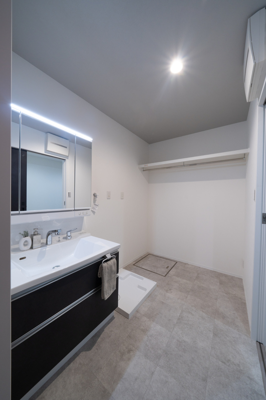 三面鏡付きの洗面化粧台で朝の身支度もスムーズに。洗濯機置き場の横には、棚板とハンガーパイプを設置。収納場所として活用するほか、室内干しスペースとしても便利です。