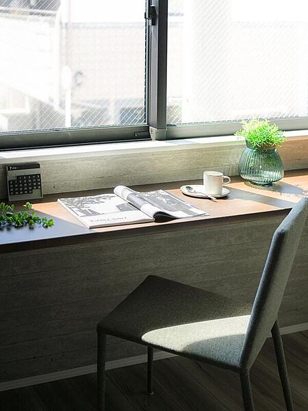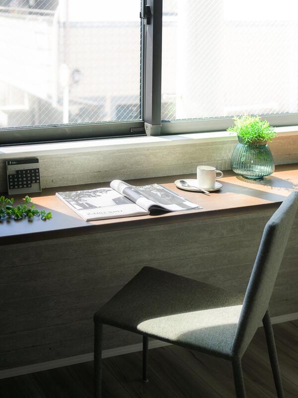 正面の窓から陽光がたっぷりと注ぐカウンターを造作。壁面には可動棚を設けているので、お仕事で使う資料やPCなどをすっきりと仕舞えます。
