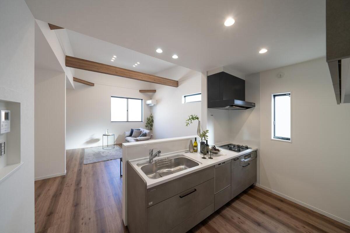 キッチンは、ご家族と会話が弾む対面式です。キッチン背面にはカップボード、シンク近くにパントリーが備わっているので、食器や食品をたっぷり収納できます。