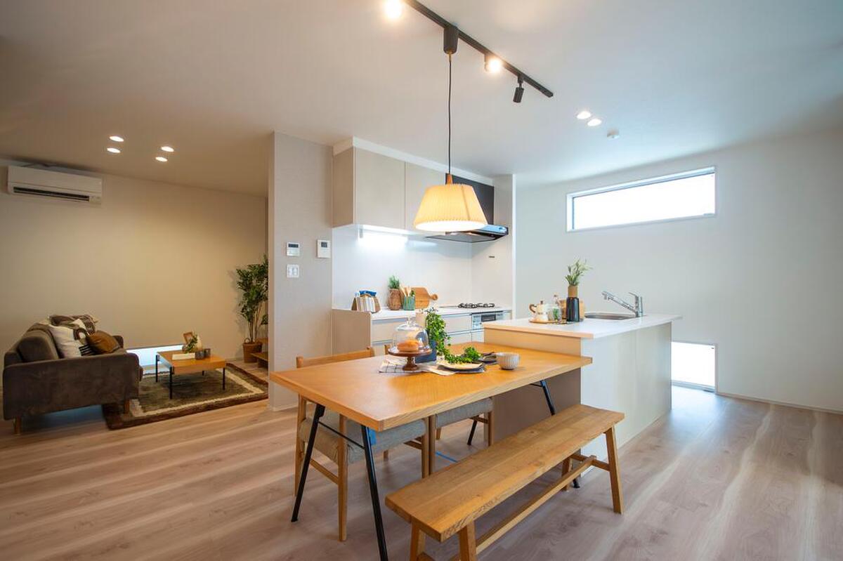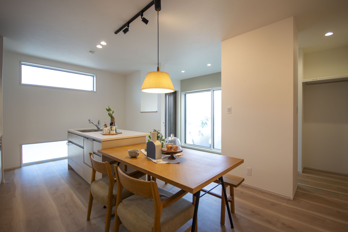 生活動線の良い1階LDKを採用。ワイドサイズの玄関にはオープンタイプの収納を設置。採光を広く取り、明るく開放的な空間に仕上げました。2階には4部屋の個室を設けています。