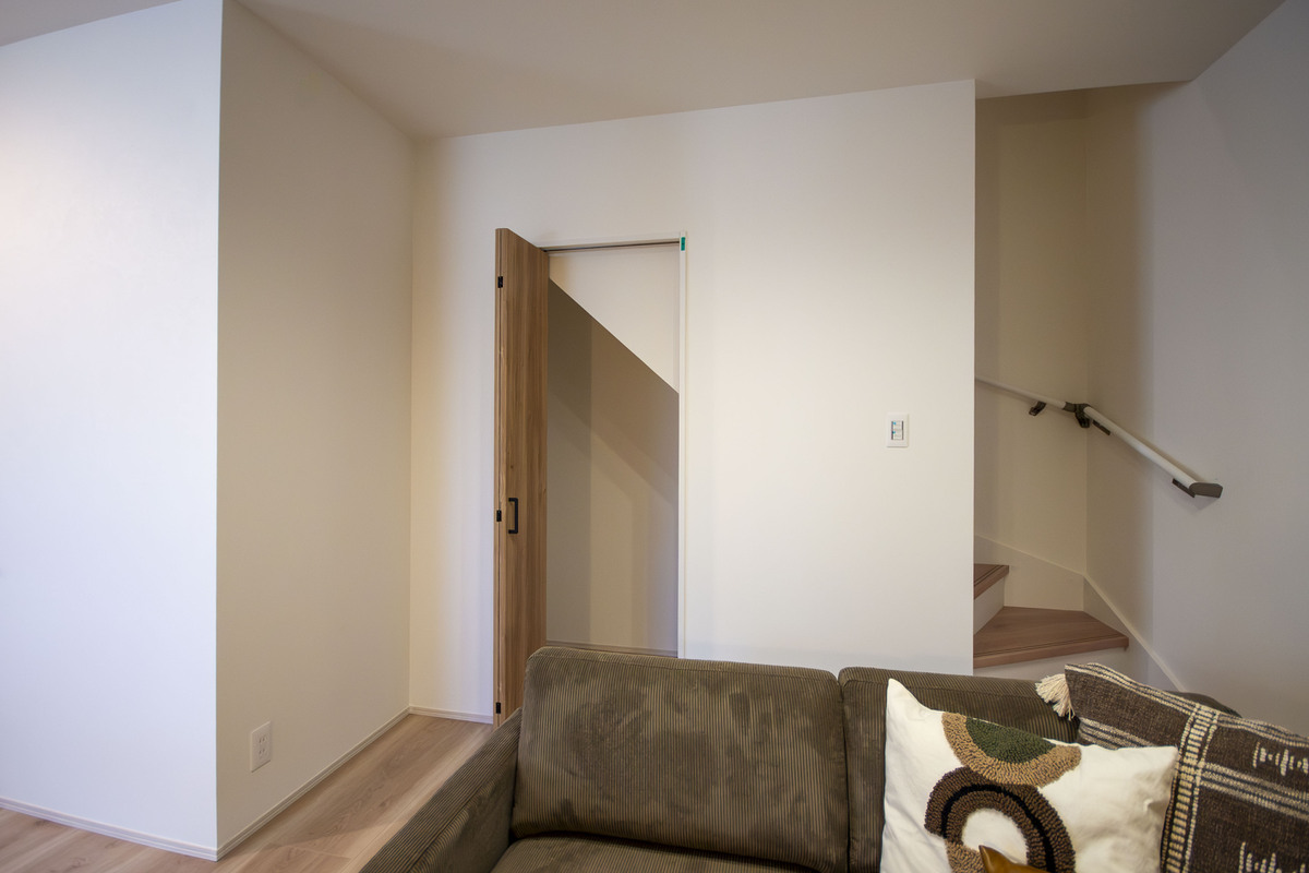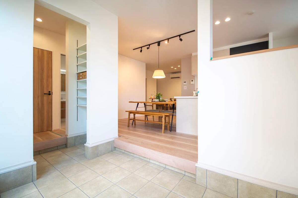 玄関は扉のないオープン仕様で、視界が広がる開放感が魅力です。ご家族や来客を心地よく迎え入れ、明るく温かな雰囲気を演出しています。
