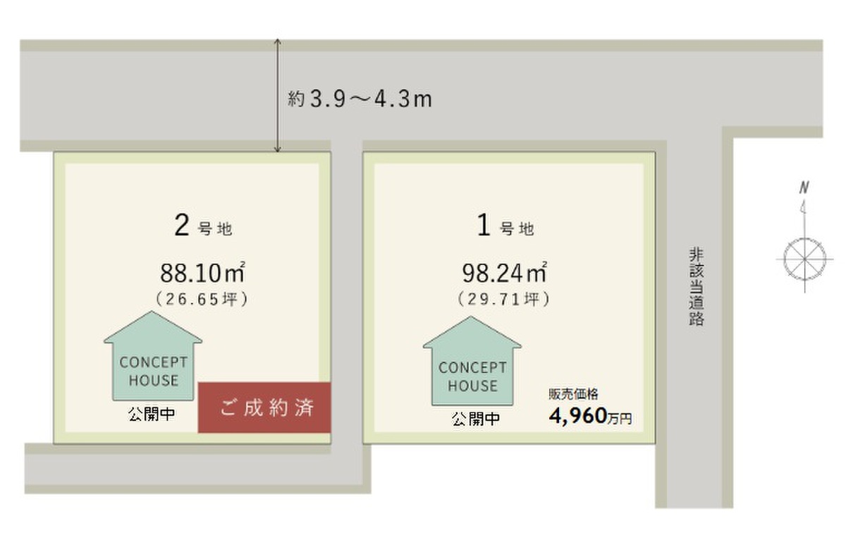 | 駐車場 | 0台 ~ 1台 | 道路の幅員 | 幅員:約3.9m~約4.3m セットバック済:(1号地)約10.9m2 |
