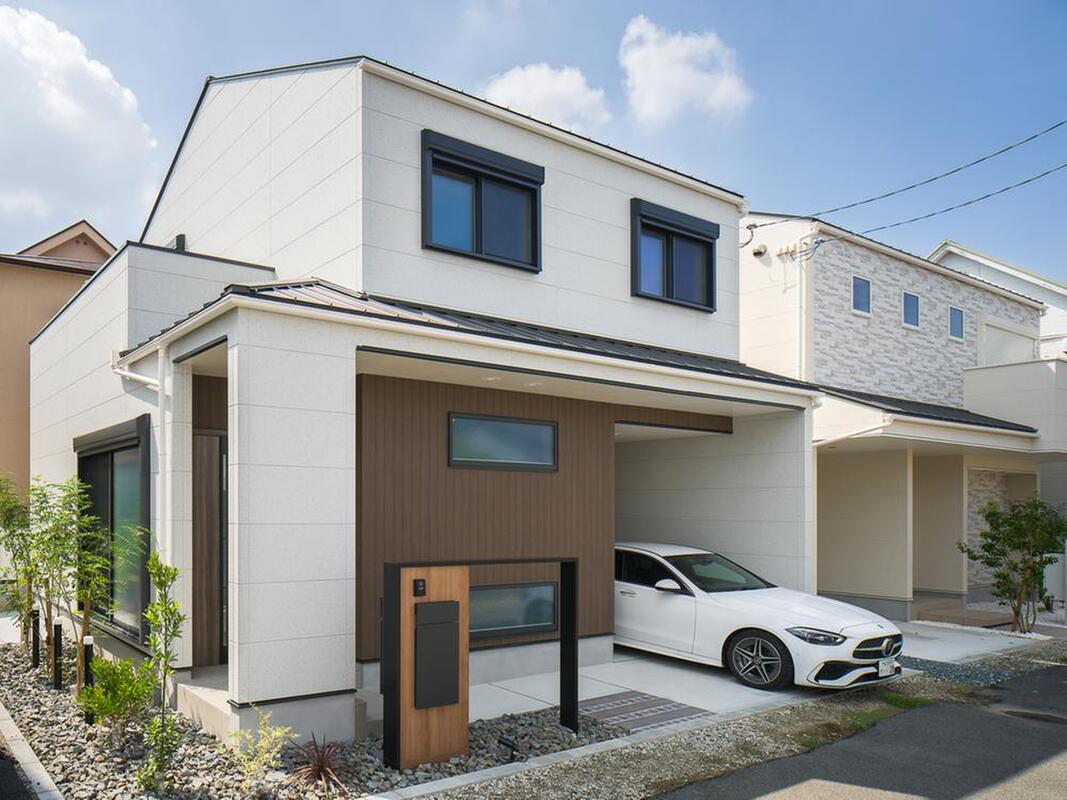 清潔感のある白を基調に、ガレージ内部にあしらった木目がアクセントになった外構デザイン。植栽の緑が映える、爽やかな佇まいが魅力です。
