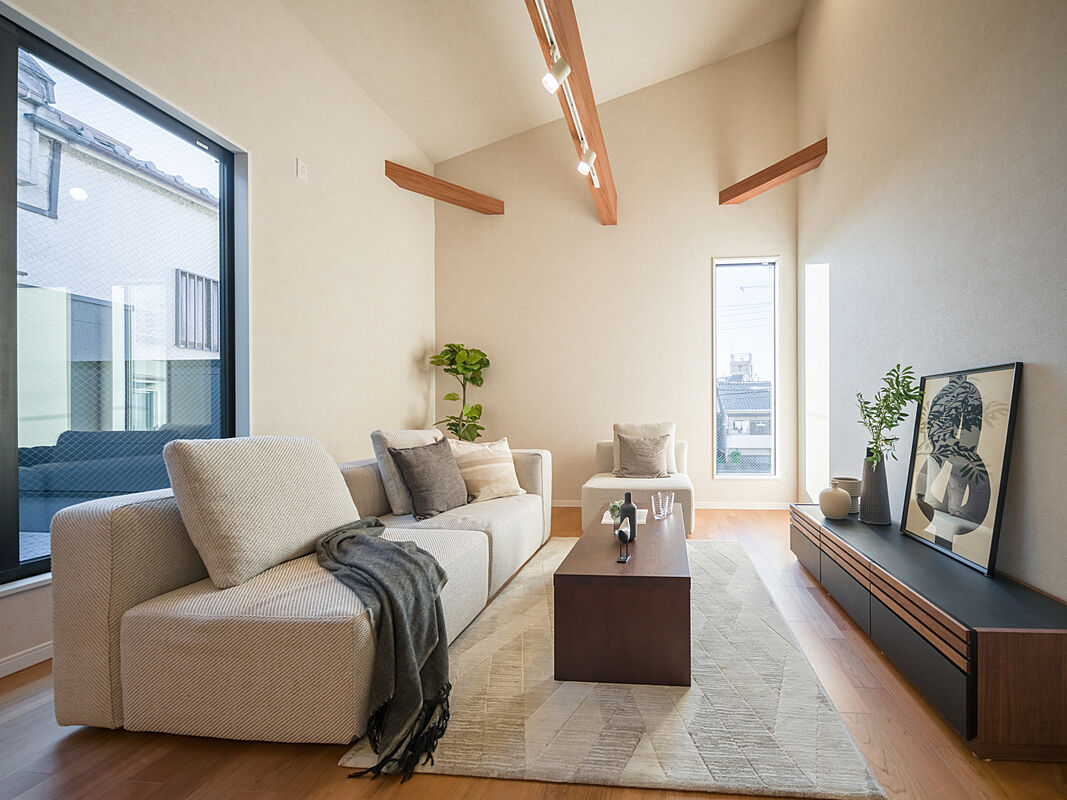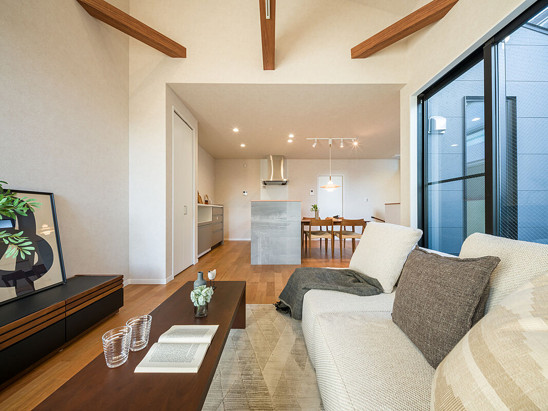 梁とスポットライトが温もりを添える、心地よいリビングスペース。...