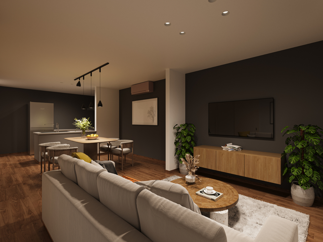 ウォルナット調の床材に、ブラックのクロスを大胆に配した重厚感のあるコーディネート。フルフラット仕様のキッチンが、空間により開放感を演出します。