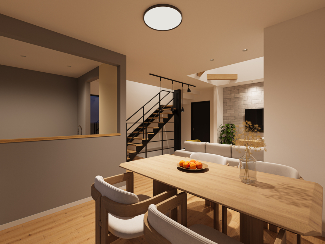明るいカラーのフローリングをベースに、ブラックのスケルトン階段を合わせることで引き締まった印象に。吹抜天井から陽光が注ぐ、温かみある空間です。
