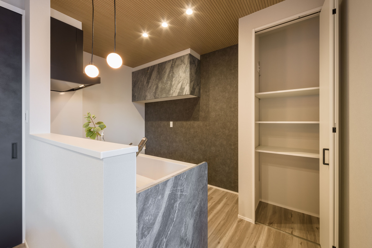 キッチン背面には、扉付きのパントリーを設置◎食料品や飲料のストック、調理家電などの保管に便利です。吊戸棚も備わっており、収納するものに合わせて使い分けも可能です。