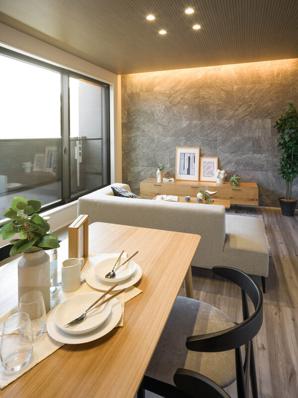 リビングの壁に、調湿・脱臭効果のある「エコカラット」を施工。上質な石目調の質感が空間のアクセントに。ダウンライトや間接照明が柔らかな光を照らし、日中と夜とで違った印象を楽しむことができます。