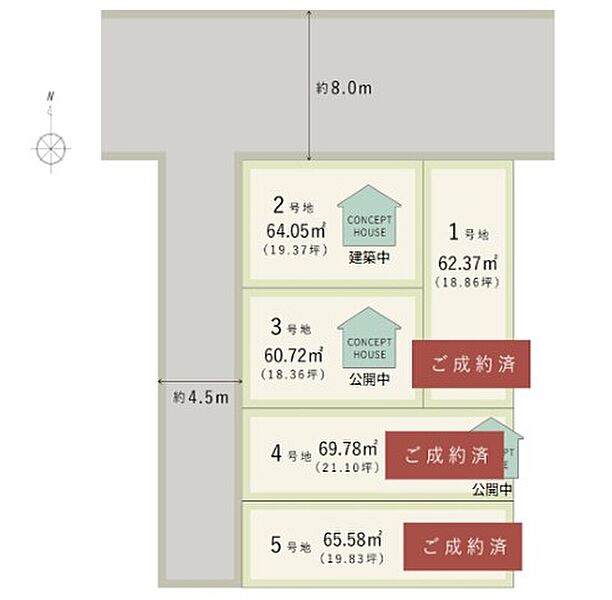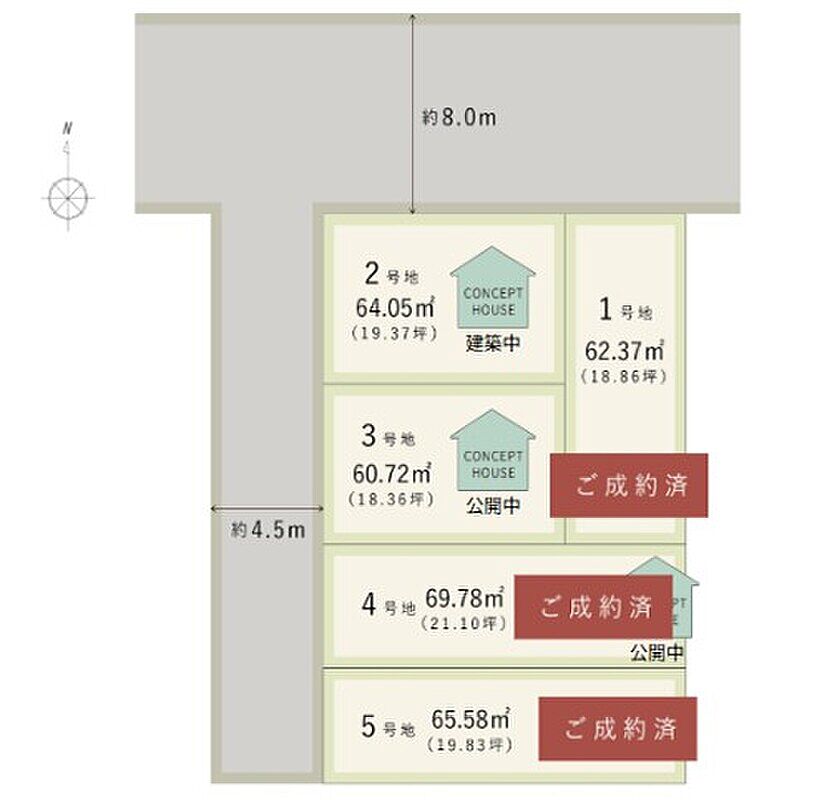 3号地の前面道路幅員は約4.5m。通り抜けができない道路のため、居住者以外の出入りも少なく、車の駐車なども落ち着いて行うことができそうです。